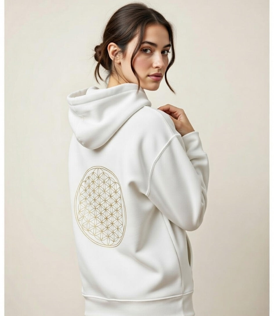 Incorpora el diseño geométrico de la flor de la vida en la parte posterior de la sudadera dejando la parte delantera libre.