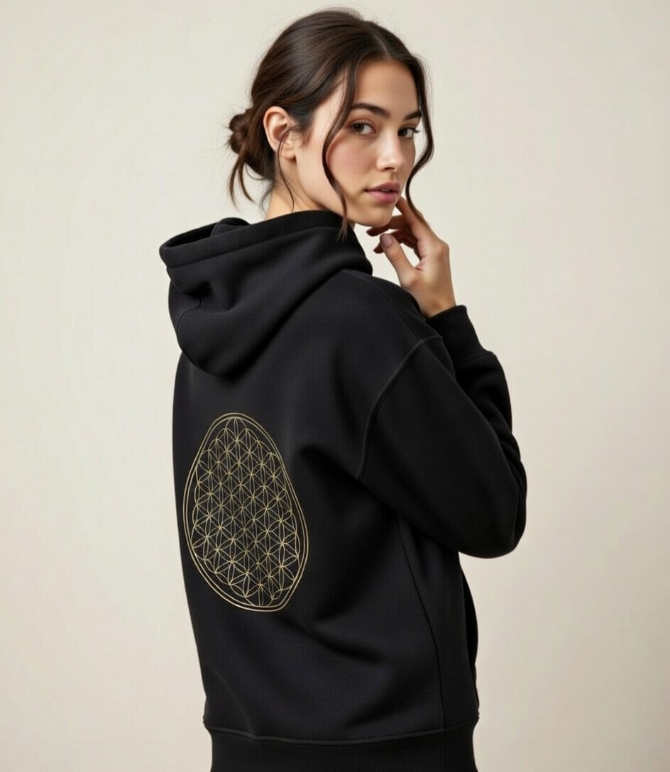 Incorpora el diseño geométrico de la flor de la vida en la parte posterior de la sudadera dejando la parte delantera libre.
